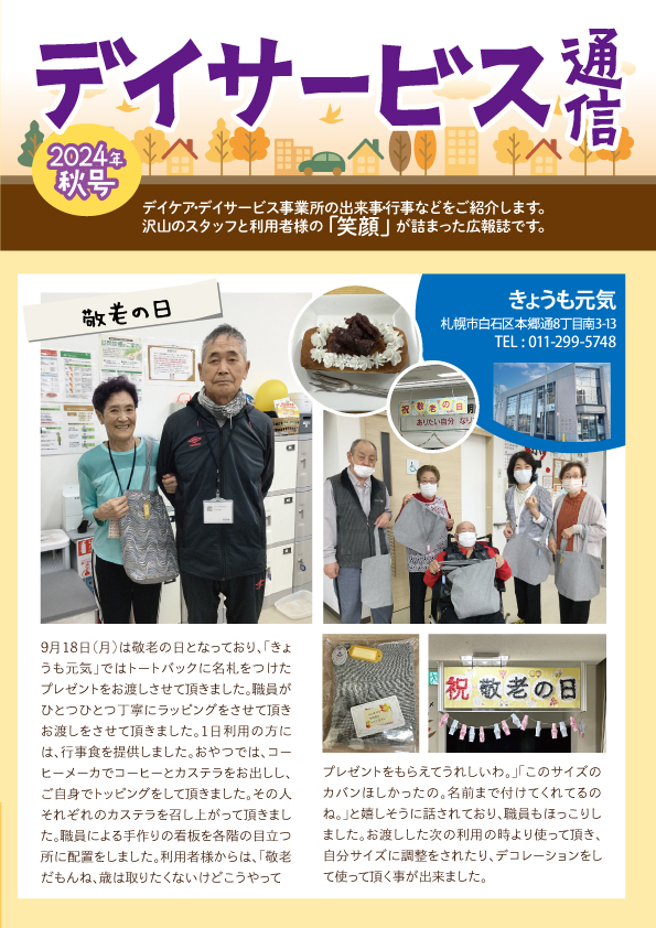 2024.10.1 令和6年デイサービス通信秋号発行のお知らせ 令和6年デイサービス通信秋号を発行いたしました。 当施設も記事を載せております。 ↑画像をクリックするとPDFが表示されます お知らせ一覧