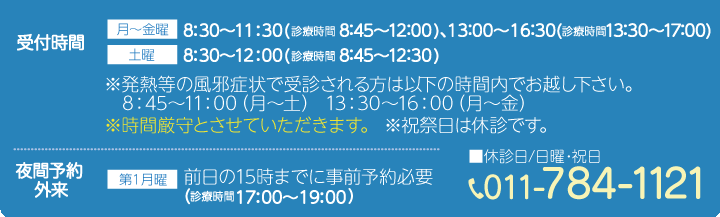 - 発熱や風邪症状等で受診希望の方は以下の受付時間内にお越しください(祝祭日は休診です)