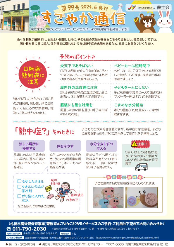 2024.06.20 すこやかこどもデイサービスセンター「すこやか通信2024年6月号」発行のお知らせ 東雁来すこやかこどもデイサービスセンターの活動情報を毎月発信する 「すこやか通信2024年6月号」を発行致しました。是非ご覧ください。 ↑画像をクリックすると PDFが開きます。 記事一覧へ >